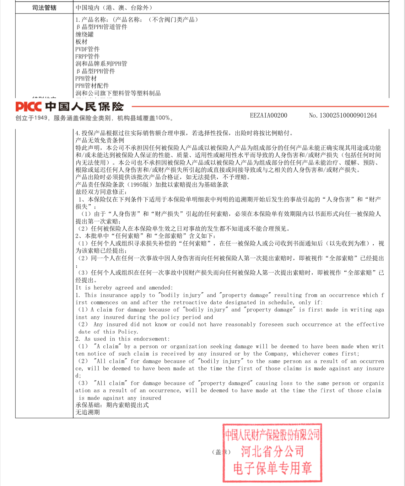 江苏尊龙凯时工程塑业工厂所生产所有β晶型PPH管阀件、PVDF管阀件、FRPP管阀件及板材缠绕罐等均由PICC承保,为您的项目企业保驾护航。多一份保障,多一份信任。